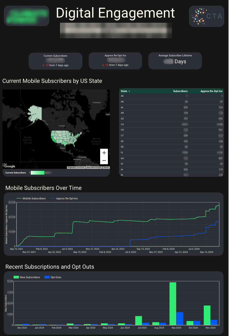 Using SQL mirror connections for both their email and text platforms, I set to pulling out the key metrics and data fields needed to track subscribers over time and the particular messages that most drove engagement. One thing that was difficult in this work was that they had been using the same email tool for years, meaning they had a large volume of data. In particular their platform tracked each send, open, click, and reply as actions in the same table. When the table reached a certain size, they simply added another table: email_activities_1, email_activities_2, etc. This was both a challenge for our engineers and myself ensuring that the complete pipeline, from ingestion to analysis, was robust enough to handle the new tables when they were created.