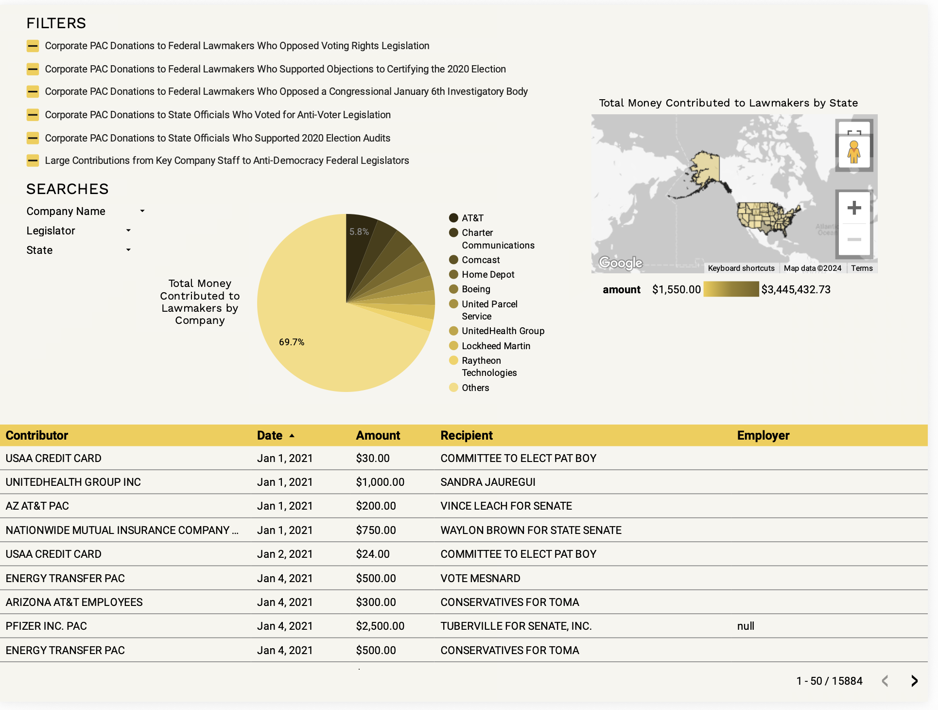 Using the dashboard as a resource, the partner organization published a scorecard holding Fortune 500 companies accountable for their political donations. The resulting scorecard was shared with journalists and advocacy groups to increase public awareness of these companies.