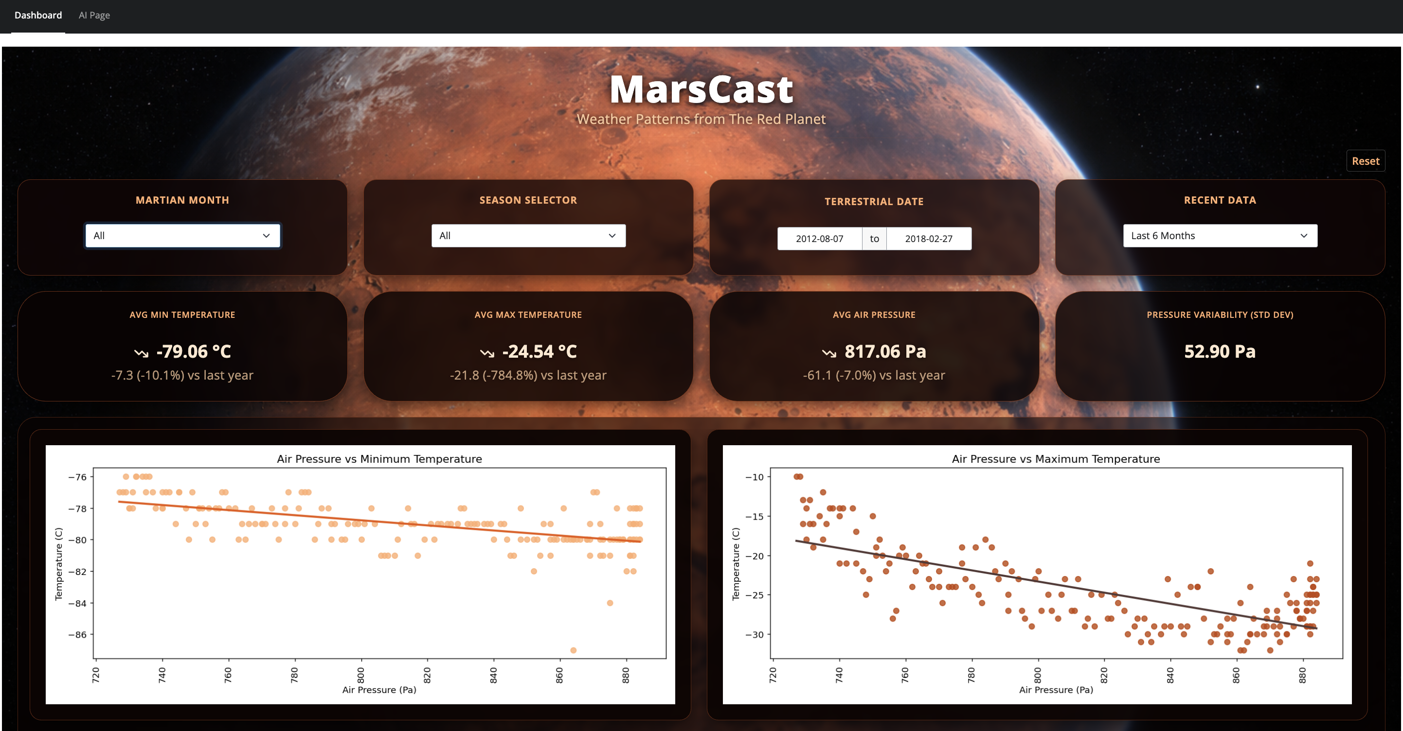 Using data collected by the NASA Curiosity Rover between 2012 and 2018, we built an interactive dashboard to explore what six years of Martian weather data reveals about surface conditions on the Red Planet.
